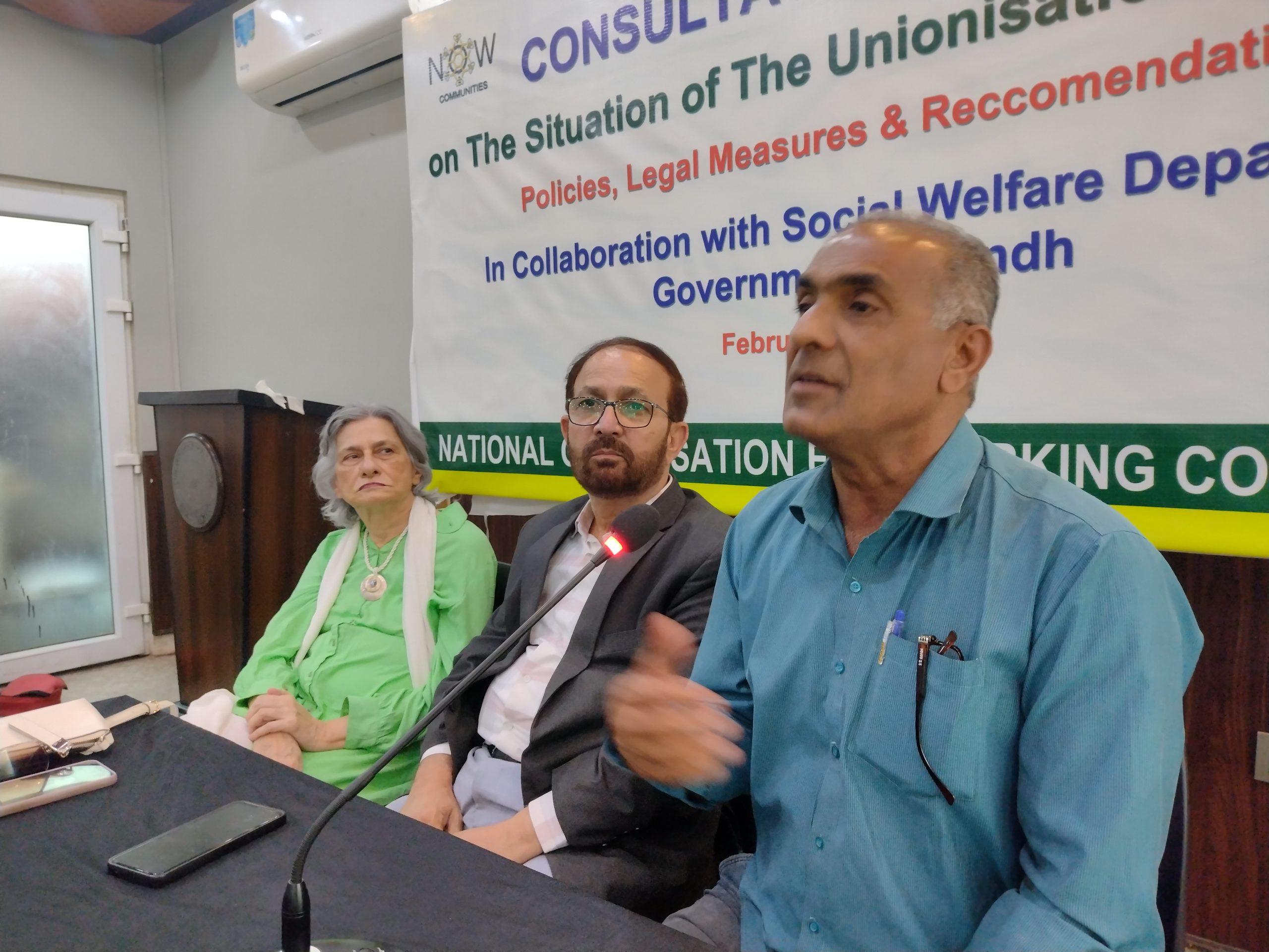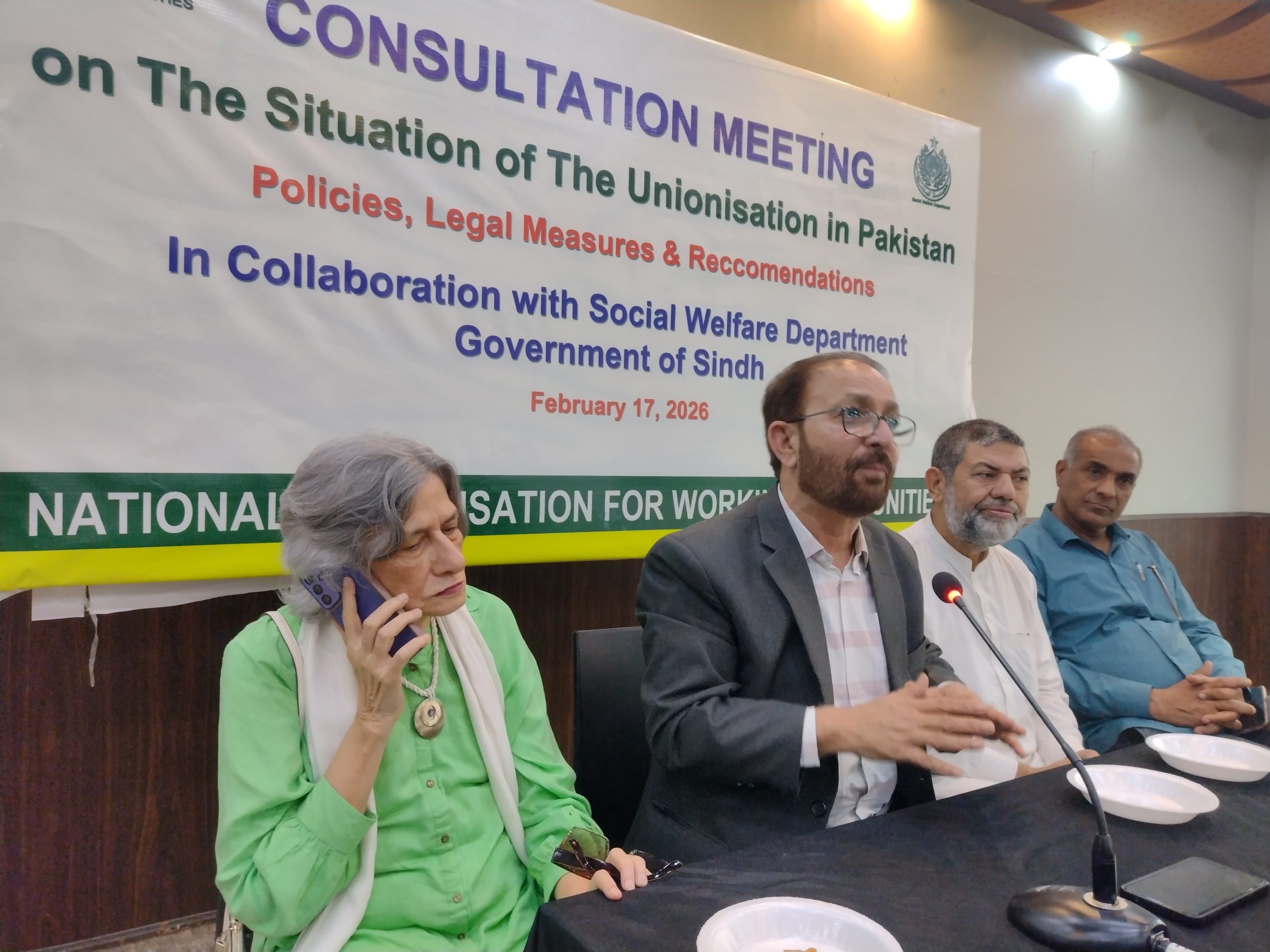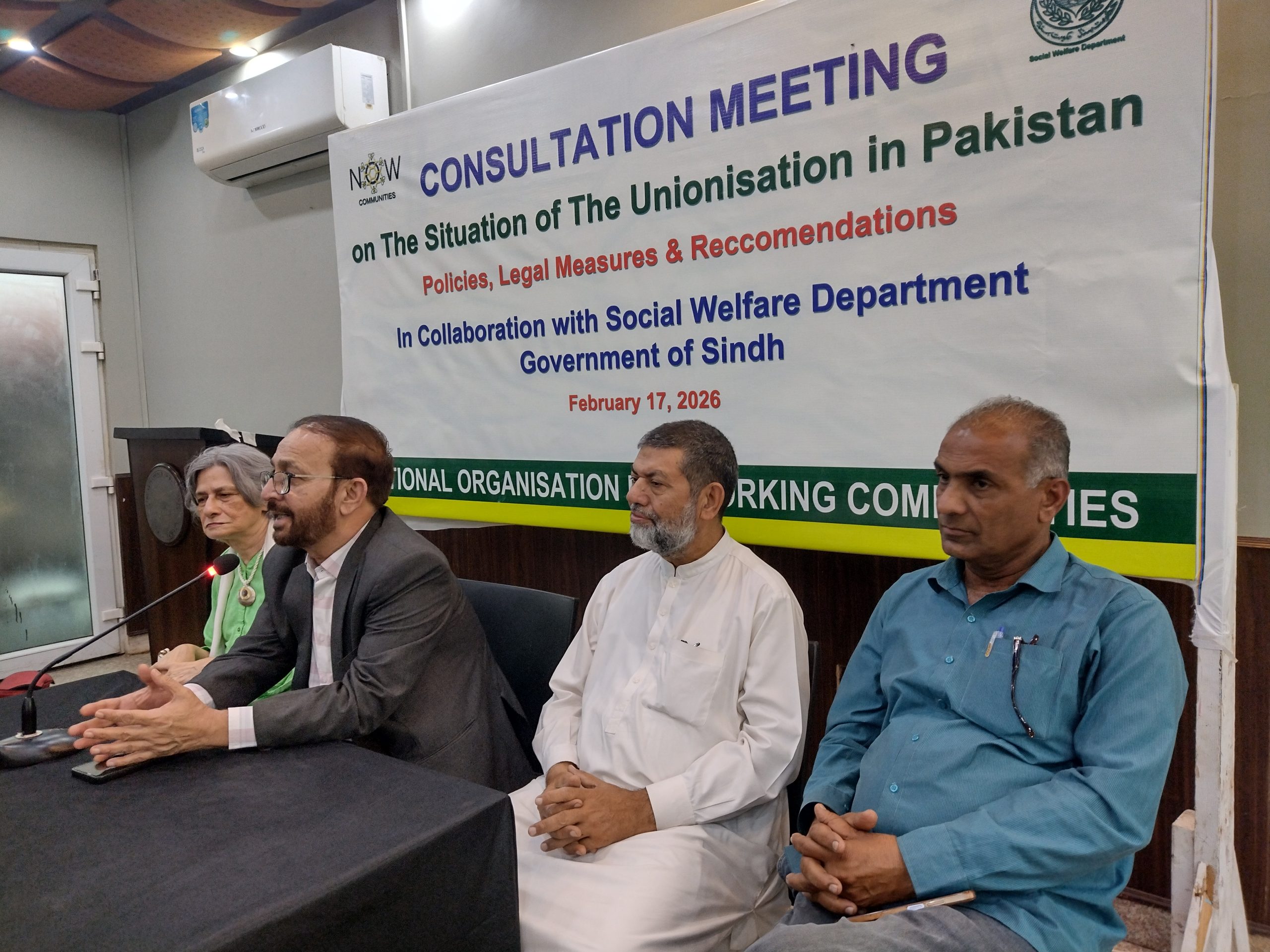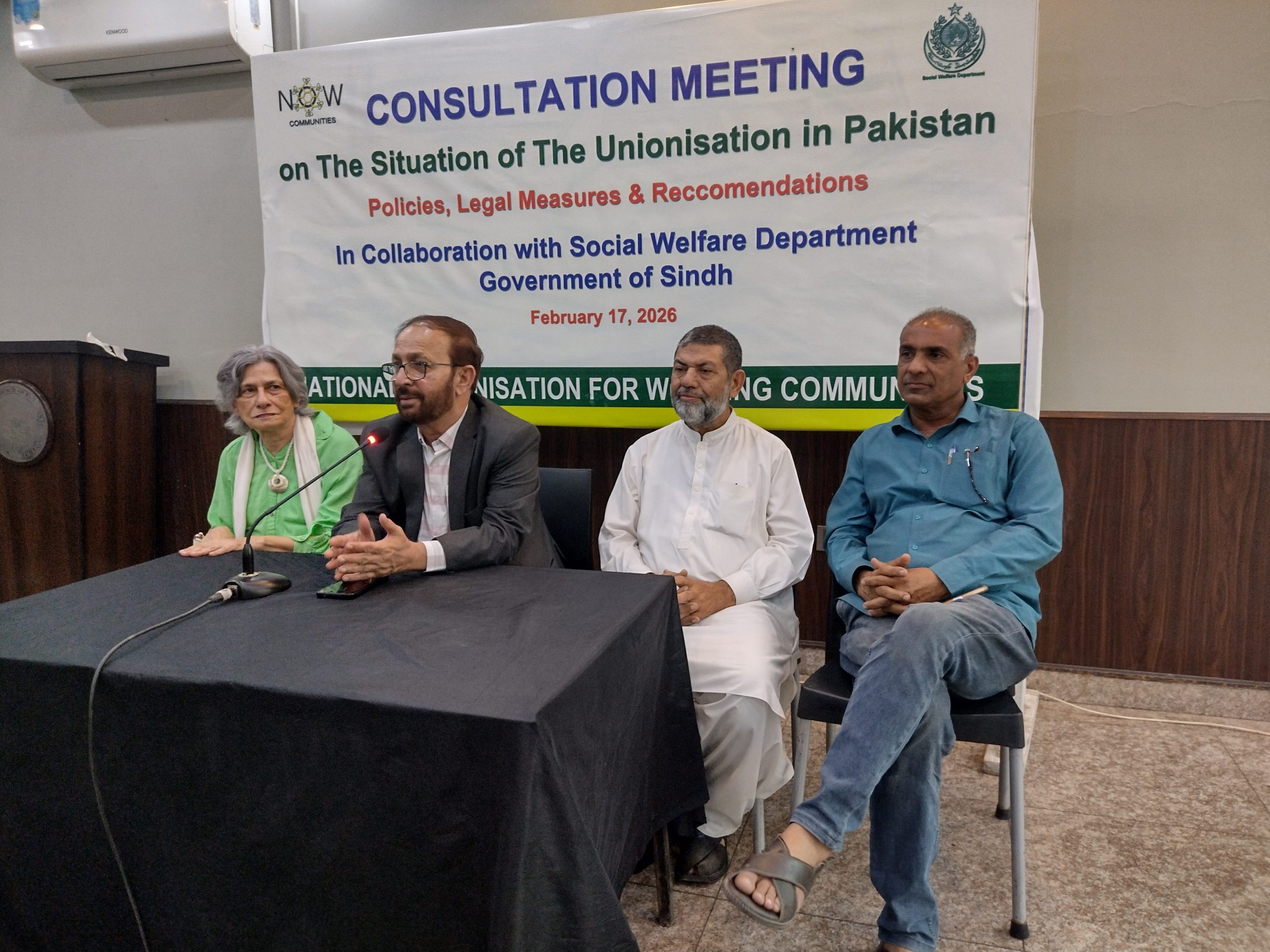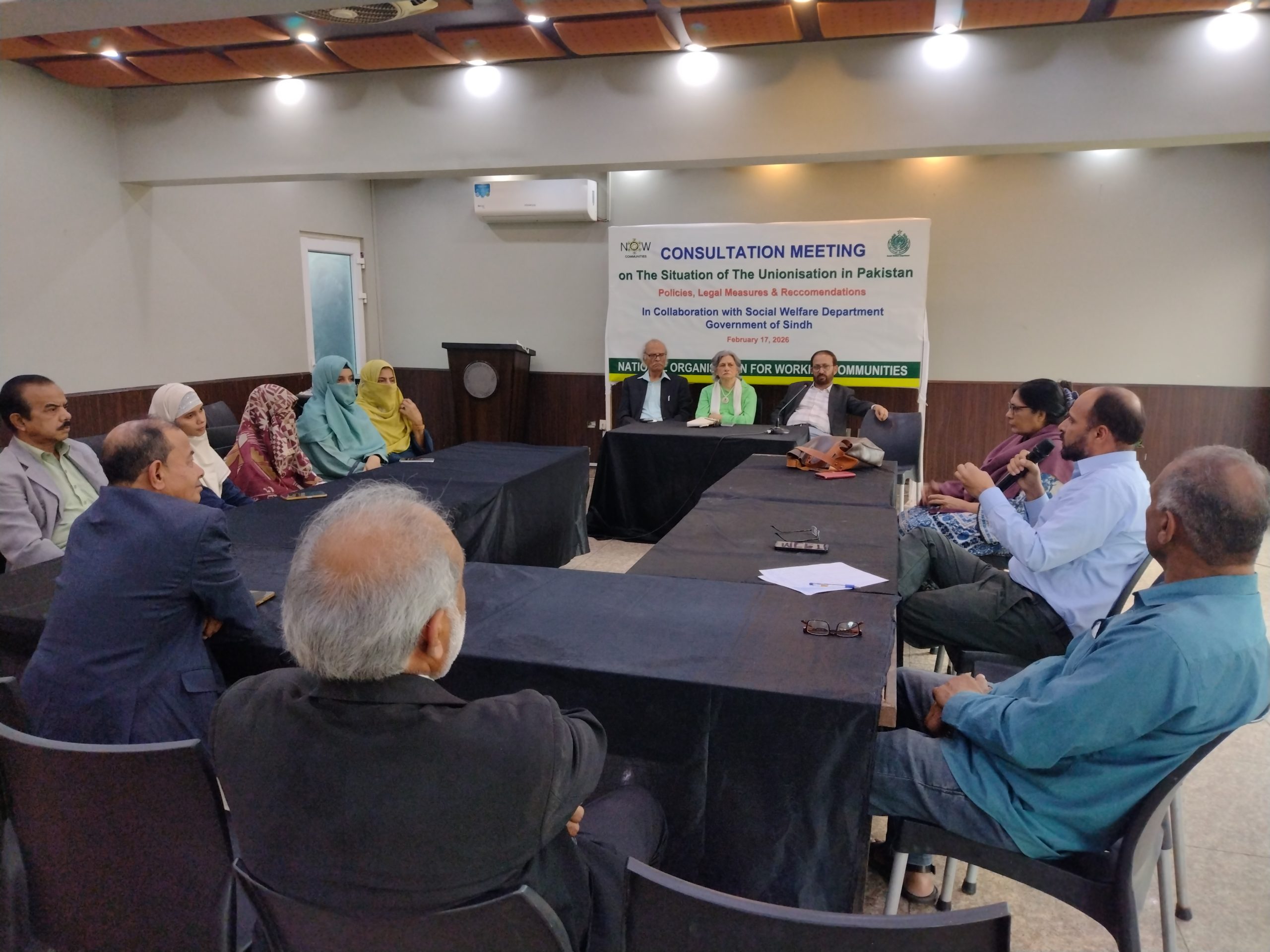 In this context, NOW Communities organized a seminar on 17 February 2026 at Gul Rang Hall, Arts Council of Pakistan Karachi. Prominent trade unionists from across Pakistan participated in the event, including Mr. Habibuddin Junaidi (President, Peoples Labour Bureau Sindh), Ms. Mehnaz Rehman (President, NOW Communities), Mr. Athar Shah (Joint Director, Shops and Establishment), Mr. Saeed Baloch (General Secretary, Pakistan Fisherfolk Forum), Mr. Bilawal Tanoli (Advocate), Mr. Zahid Ali (Advocate), Mr. Hussain Badshah, Mr. Zubair Ahmed, Mr. Iqbal Ansari, Ms. Shehnaz Syed, and Mr. Muhammad Shafi. The session was moderated by Ms. Farhat Parveen, Executive Director of NOW Communities.